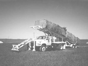 The hydraulically-powered unit consists of an up-front bale fork, an inclined plat-form that extends up over the cab, and an unloading rear platform. You spear a bale and set it on the platform over the cab while the truck is in motion. When you retract the bale fork, the bale slides by gravity to the back of the front deck. The entire process - from the time the front tines strike the bale until it's in place on the flatbed - takes only 12 seconds.