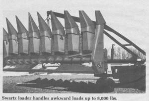 "Our greatest number of sales have been to implement dealers but we've also had a lot of farmer interest. Farmers are using the loader with a fork lift attachment, or with a scissor-like grappler, to haul big bales. The loader will carry much more weight than conventional front end loaders. We also have a barrel attachment for carrying 55 gal. drums," says Swartz.
