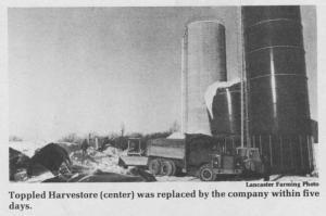 The collapse of the "almost full" steel and fiberglass structure was the unfortunate finale of slightly more than a week of watching and waiting for Penn-Jersey Harvestore Systems, Inc. and dairyman John Krall of South Lebanon Township and his family. Sons Tim and Tom, who work on the family dairy operation, were joined by John and daughter-in-law Shirley in a vigil Monday evening, anticipating the fall of the leaning blue tower.
