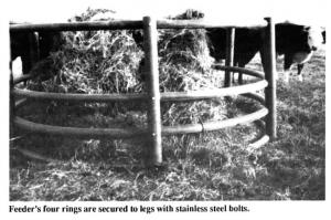 The 8-ft. dia., 3 1t2-ft. high feeder is made from lightweight plastic pipe. It weighs just i 5 lb The feeder's four rings are secured to the legs with stainless steel bolts.