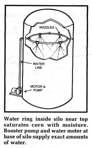 Wortman's system consists of a "water ring" that's about 2 ft. smaller in diameter than the silo. It mounts inside at the top and is connected by pipe to a booster pump at the base of the silo and a water meter that lets you add just the right amount of water.