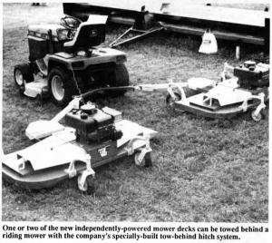 Adams, who operates a lawn care business, mows nearly a dozen yards in two local towns. Previously he used three riding mowers - two 60-in. models and a 50-in. model. Now he tows two 60-in. mowers behind the 50-in. riding mower and cuts as much grass by himself as three men did before.