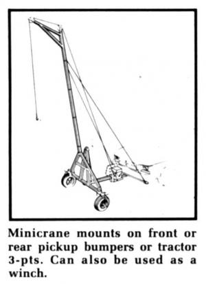 Portable Minicrane For Pickups,Tractors PICKUPS Accessories 7-2-33 You'll like this portable Minicrane that attaches to pickups or tractors to handle tractor tires, engines and other heavy loads. The Minicrane, introduced by the A.M. Minicrane, Corp., Cassopolis, Mich., lifts up to 750 lbs. in its crane configuration and pulls with up to 1,250 lbs. of force when rigged as a winch.