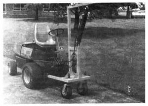 Lehnert used 2-in. sq. tubing to build a lift frame that simply pins in place on the mower mounts and is supported by two caster wheels off the mower deck. A 2 by 24-in. hydraulic cylinder, powered by the mower's hydraulics, raises and lowers a hinged steel arm that's pinned to the top of a vertical post. A boat trailer winch mounts on the lift arm.
