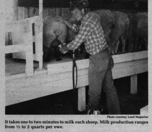 It takes one to two minutes to milk a sheep. Production ranges from 1/2 to 2 liters, depending upon stage of lactation and breed. Ewes are milked twice a day. The sheep milking equipment (Alpha, Lavar and Fullwood) is made in Europe.