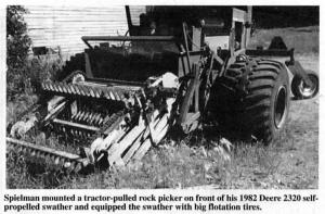Once a field has been seeded with small grains, it's virtually impossible to get back into it to pick up rocks without doing a lot of damage, unless you pick them out by hand. Mark Spielman, Twin Valley, Minn., got around the problem by mounting a tractor-pulled rock picker on the front of his 1982 Deere 2320 self-propelled swather and equipping the swather with big flotation tires. When he's done picking rocks the swather converts back for harvest.