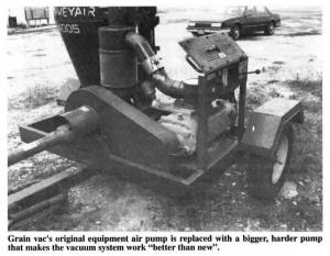 "Air pumps are the biggest cost on a grain vac. However, most grain vacs don't work well because manufacturers over-rate their air pumps - they don't allow for tractors with slow pto's, wet corn, liners, el-bows, or rubber on the end of the nozzle. The grain vac may be rated at 4,000 bu. per hour but actually have a capacity of only 1,700 bu. per hour - and therefore it takes 45 minutes to load a semi. The bottom line is that if the air pump is weak, the air lock runs half empty all the time.
