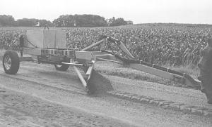 The 20-ft. long, 2-wheeled grader is equipped with a 14-ft. blade that can be tilted from side to side or hydraulically set at a 55 degree angle in either direction. The rig has three hydraulic cylinders - one to raise or lower the machine, one to adjust blade angle, and one to adjust side-to-side tilt. A 2,700-lb. cement block mounts on top at the rear. The unit has a transport width of 9 ft. and can be pulled behind any 3/4-ton or larger pickup at highway speeds.