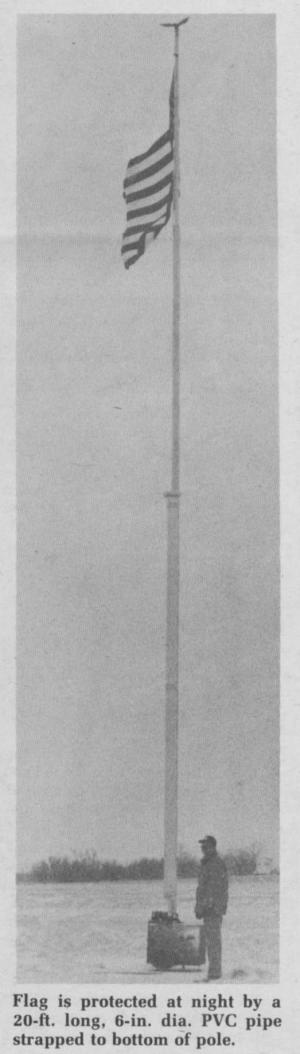 The pole itself consists of 40 ft. of 4¢-in. dia. drill stem at the bottom and 15 ft. of 2 7/8-in. rod at the top. A 20-ft. long piece of 6-in. dia. PVC plastic pipe attaches to the bottom of the pole and it's into this protective pipe that the flag is lowered each evening. The cable simply pulls the large flag down into the pipe. In the morning, it pulls it back out again.
