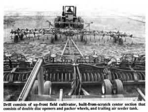 "Any type of air seeder could be used and it could be pulled between the cultivator and drill or pulled directly behind the tractor with everything else pulled behind it. Hitches are designed so the tractor, cultivator, drill and seed tank can be turned in a radius no larger than if you were pulling a gang of drills the same width.