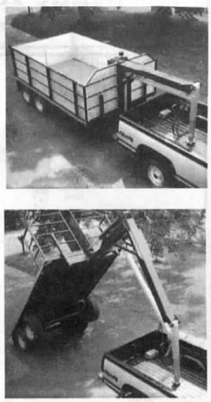 The top bar of the gooseneck is made out of 6 by 8-in. tubing. It pivots at the top of the center post. A second horizontal bar, made out of 3 by 4-in. steel tubing, mounts just below the main bar. It runs from a pivoting hinge point on the center post to a sliding shuttle mechanism mounted on a framework at front of the trailer. A hydraulic cylinder mounts vertically inside the framework. When activated the cylinder pushes down on the front of the trailer, pushing upward on the gooseneck. As the gooseneck lifts, the shuttle slides in front, leveraging itself against the smaller 3 by 4-in. bar that runs back to the center post.