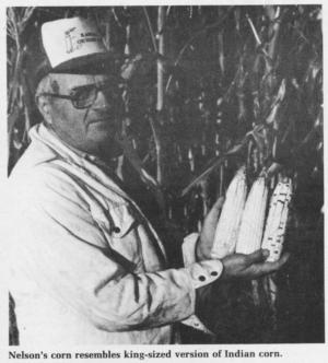 The big-eared corn looks some-thing like a king-sized version of Indian corn, with multi-colored kernels. Nelson says livestock seem to prefer silage made from the corn. "A test analysis has shown the corn contains 22 trace minerals compared to only 8 to 12 minerals in hybrid varieties so I feel it is more nutritious."
