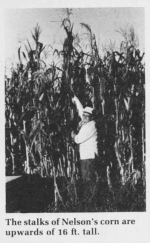 The new corn has been yielding around 100 bu. per acre without irrigation and Nelson has been selling seed to neighboring farmers. Last fall. however, a prairie fire swept through hundreds of acres in the Salina area and wiped out his 10 acre plot. He was not able to sell seed on a wide-spread basis but had enough carried over from the year before to replant this year.
