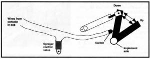 "The switch should be activated by a spring so it will maintain constant contact. Once the switch is mounted, unplug one wire at the control valve and extend the wire to the switch, and then run it back to the control valve. You can still shut the sprayer off from the cab.