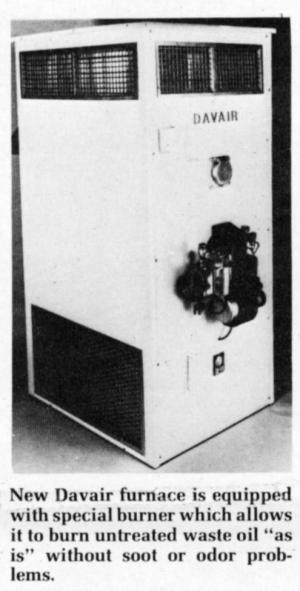 It's the new fully automatic, direct-fired Davair furnace which operates on untreated waste crankcase oil. Developed in England, it's reportedly the first fully automatic and thermostatically controlled space heater which uses untreated waste engine oil as it comes out of vehicles.