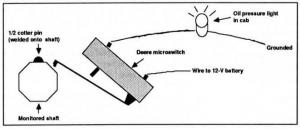 "I welded half a cotter pin to each shaft and then installed a microswitch alongside. The microswitches are standard off-the-shelf units from Deere that are normally used on Deere's combine straw walker monitor. As the shaft turns, it triggers the microswitch each time the switch passes over the cotter pin. The switch is wired to a bank of three lights on a panel in the cab - one light for each switch. The lights are simply oil pressure `idiot' lights. Every time the shaft makes a revolution, it closes the circuit, blinking the light. If the light stops blinking, I know I've got a problem. Works day or night and is foolproof."