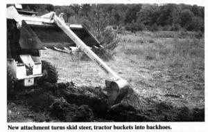 The 11-in. BucketHoe attaches to virtu-ally any bucket with two over-center clamps at the top and is secured by chains that wrap around the back. Will dig as deep as 4 ft. by adjusting the length of the arm. It can be attached and detached in a minute.
