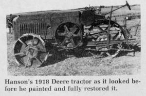 Hanson says his green, yellow and red tractor, described in 1918 brochures and advertisements as "The John Deere All-Wheel Tractor" ù was one of 200 built between 1916 and 1919, and that his is the only intact one in existance: "It bears serial no. 191879, which signifies that it's the 79th John Deere tractor manufactured in 1918, which is nearly six years prior to the introduction of the Model D, the tractor Deere has claimed to be their first."