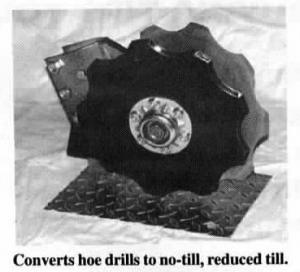 New double disc opener for Deere and International hoe drills does the work of a coulter, row cleaner, and zone tiller in a single unit, converting a conventional hoe drill to no-till or reduced tillage, says Consertil, Inc., Witten, S. Dak.