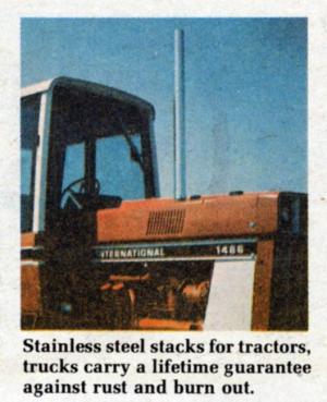 Thomure Mfg. also offers chromeplated or stainless steel exhaust stacks to fit most makes of tractors and trucks. Cost of a stainless steel stack 48 in.