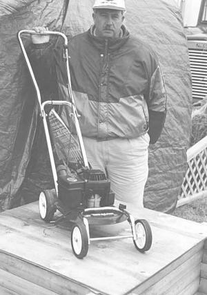 "It eliminates the muscle ache and strain of carried trimmers" says Trim-A-Lawn of its new "walk behind" lawn trimmer and leaf mulcher. Its cutting head is laced with two or four 0.130 in. dia. triangular-shaped cutting lines that "quickly and evenly power through grass and weeds that overwhelm other types of trimmers. It takes a 15 in. swath and is great for even, close-up trimming around rocks, fenceposts, buildings, trees, ditches or culverts. "