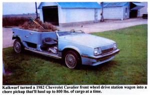 "My wife uses it to do yard work. She likes it because it has power steering, an automatic transmission, radio, and tape deck. The car's rear speaker is mounted in front of the box, and I keep a cooler full of pop in the front seat. Teenagers like to drive it so much they don't complain about having to pick up rocks.