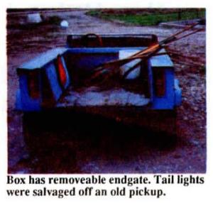 He cut off the windshield, roof, sides, doors, and back seats but left the floor intact. He cut off the door posts at the right height to support a 4-ft. long, 3112-ft. wide box that he built from 1/8-in. steel. The box has a removeable endgate. He welded three steel cross members to the car frame, then bolted the box on top of them. He also removed the front seats and replaced them with a pair of Cub Cadet riding mower seats.