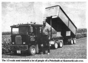 The 1/2-scale semi-truck is 4 1 /2 ft. wide, 5 ft. 10 in. high at the top of the cab, and 23 ft. long. It's powered by a 4-cyl. Isuzu diesel out of an old Chevette car. The automatic transmission and rear end were also taken from the Chevette. The hydraulic power steering is out of an International 303 combine. Kelm used 4-in. channel iron to build the tractor frame and 3 by 4-in. rectangular steel tubing for the trailer. The cab was fashioned out of sheet metal and has a custom-made chrome-plated front bumper and an aluminum grille. The driver and a passenger sit on a pair of vinyl seats de-signed for a fishing boat. The trailer is all metal with a hand-crank tarp roll on top and a hydraulic lift hoist underneath.