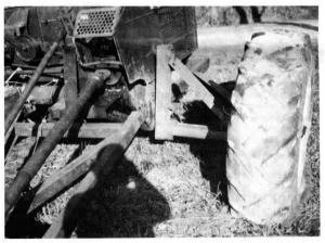 Sachar made other modifications to the picker. The twisting action caused by pulling the picker sideways in mud (before the left wheel was extended) caused the axle on the right side of the picker to break, so he reinforced it. He used a wheel assembly equipped with a 2 1/2 in. dia. axle stub and welded a bracket for it onto the original mounting hole on the right wheel. He also replaced the right tire with a bigger 13.6 by 26 rear tractor tire for added flotation, removing a shield so that it would fit. He replaced the original 9.50 by 15 tires on the wagon with 9.50 by 20 tires for more clearance. He hooks the wagon on behind the extreme left side of the picker.