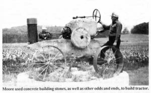 It all began when Moore and his wife, Jerry, were sprucing up the place for their daughter's wedding in 1987. They ended up with a pile of junk that included large wheels that once formed the base of a child's teeter-totter and large concrete building stones, as well as other odds and ends. As he looked at the stuff, he realized he had the makings of a "stone-age" tractor sculpture.