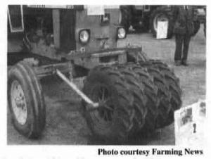 Workers at an Ipswich farm helped solve the problem of bulky straw swaths by coming up with the "Straw Depressor" - a set of 5 rubber-tired wheels that mount on front of the tractor pulling the baler. The wheels roll across the top of the windrow, depressing the straw enough to keep it from catching on the underside of the tractor and providing a more compact swath for the baler.
