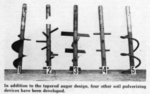 The original plan was to mount an inclined, rotating, tapered auger - similar to a giant woodscrew - behind a subsoil shank. Four other hydraulically powered soil pulverizing devices (see photo) were subsequently developed and tested in a heavy Davison clay loam soil at the experiment station, located in Griffin, Ga. The subsoil shank (one row unit) was operated at a depth of 18 in., and the pulverizes attachments at a depth of 14 in.