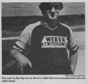 "I'd have went without before I'd have worn a hook," Steve asserts. But doctors feel that Steve will eventually be able to flex his toe and become quite adept at using it as a finger.