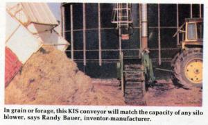 "It does everything a stationary conveyor box will do, yet sells for only about 1/3 as much," says Randy Bauer, Mina, S. Dak., inventor-manufacturer of the new KIS (stands for "keep it simple") conveyor box for high-speed loading of all types of forages or grain into upright silos. "We think it's the fastest, most economical and trouble free way of filling upright storage."