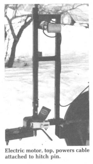 The hitch consists of a mast mounted on the drawbar that's about 4 ft. high with a small electric motor at the top powering a cable that runs down to a hitch pin at the bottom. The operator simply backs the drawbar up to the adaptor on the tongue of the implement and then activates the pin so it drops down. The donut-shaped implement adaptor is slightly larger than the hole in the tractor drawbar so the pin easily slides into it.