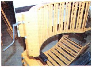 All bars in the concave can be opened or closed as needed with a hand crank. "The concave features a new design that eliminates plugging in tough crops like high moisture corn and greatly reduces cracking in beans and other crops. In some crops, especially beans and wheat, farmers who've tried the concave find they adjust the con-cave several times a day according to the condition of the field they're in orthesize of the grain itself," says Moulet..
