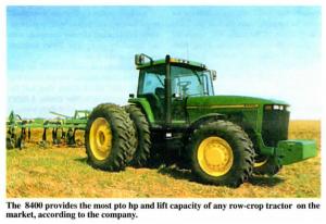 Powertrain performance - The 8100, 8200 and 8300 are powered by a 6-cyl. 7.6 liter diesel; the 8400 by a new 6-cyl. 8.1 liter Deere diesel. Both engines meet 1996 emissions standards, both are turbocharged, and both are air-to-air intercooled for in-creased performance.