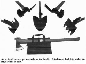 The "Multi-Max" comes with a 36-in. long hickory handle or a 34-in. long unbreakable fiberglass poly handle. Mounted permanently on the handle is an axe head that comes with a thick leather sheath to protect the edge of the axe. The attachments lock into a socket on back of the axe head. The beveled socket and tapered attachments tighten during use and are held in place by a hitch pin for safety. All the attachments come in a canvas carrying bag that fits under your vehicle's seat.