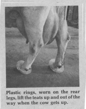 The plastic rings, worn on the rear legs, lift the teats up and out of the way when the cow gets up, thus preventing the costly problem of losing top-producing cows because of teat injuries. Each ring is 9 1/2 in. in dia. and made of a special plastic which resists manure acids and is pliable. When the cow lays down, or when she steps in deep mud, manure or snow, for example, the outer edge of the pliable ring folds up against the leg, the manufacturer points out.