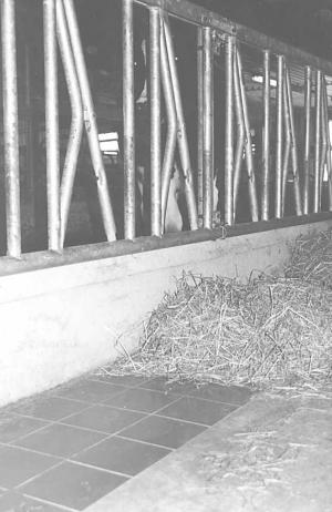 The tiles line mangers on each side of the 200-ft. long barn. Three rows of the 8-in. sq. by 1/4-in. thick glazed ceramic tiles were used. Cost of tiling the mangers, including using acid-resistant grout, was $2.50 per sq. ft.