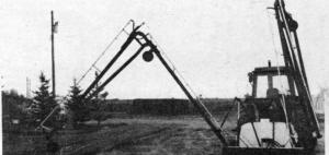 The booms are hooked to dual hydraulics so that each can be raised or lowered independently, right from the driver's seat. For transport, the booms fold and lift vertically. Two small wheels support each boom in the field.