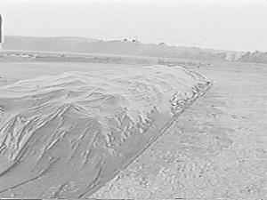 The silage is then dumped onto the 15-ft. span from Wright's 5-ton Richardton dump wagon starting about 10 ft. from one end. Subsequent loads are dumped so they overlap, forming a continuous windrow of 8 loads in the first row.