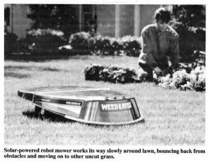 The first-of-its-kind, solar-powered "Weed Eater Robotic" is totally automatic, keeping your lawn at a pre-set height with-out refueling and requires virtually no maintenance. It senses the height of un-cut grass and shuts down if grass is too wet to mow. A bank of solar cells on top direct-drives the mower blades. It works its way slowly around a lawn, bouncing back from obstacles and moving on to other uncut grass. (On yards without a natural boundary to turn the mower, you run an underground wire that sends a signal to the mower as it approaches. The underground wire is charged by a solar unit). Sells for about $2,000.