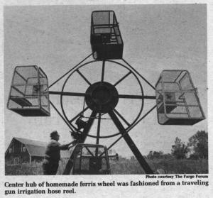 A ferris wheel built from junk parts entertains kids at fairs and carnivals in Aneta, N. Dak., thanks to retired farmer Herlof Huso, 70, who got into the inventing and manufacturing business when he quit farming several years ago.