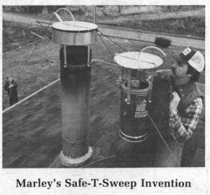 Marley's Safe-T Sweep Invention FARM HOME Miscellaneous 10-1-4 The new Safe-T-Sweep invented and patented by C.F. Marley operates from ground level, utilizing a specially designed weighted brush suspended by a bracket above the chimney top. The weighted brush is moved up and down by means of a cable which you operate from ground level, allowing you to easily sweep the chimney every week or two without having to climb onto the roof.