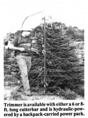 The sicklebar-type trimmer - available with either a 6 or 8-ft. long cutterbar - is hydraulic-powered by a compact backpack-carried power pack consisting of a small gas engine driving a hydraulic pump. A hydraulic line runs under the operator's arm to a small motor on the cutterbar. A 2-handed carrying handle makes it easy to walk around a tree in seconds, cutting it down to perfect Christmas-tree shape.