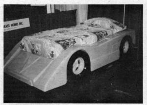 Available in a wide variety of colors, it takes a standard single bed mattress and box spring. Entire car body is supported off the floor by the 8 1/2-in. wide non-turning wheels which are flat on the bottom. The car itself weighs 100 lbs. and is 98 in. long, 55 in. wide and 22 in. high at the sides.