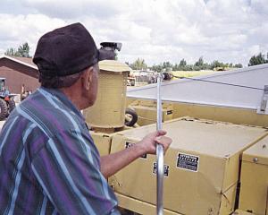Dzen also makes portable grain storage bags and vinyl covers for auger motors, aeration fans, seeders and chemical applicators, etc. (Vol. 19, No. 4). "One of my customers asked me if I could sew a vinyl cover for his combine hopper and I said that I could. Then he said that it sure would be nice if it would roll up. That's when I started thinking, æWhy not?'", says Dzen.