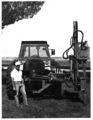 Our post driver uses a solid frame to mount to the tractor - not a 3-pt. hitch - and swings in either direction. It can also drive posts into the ground at an angle. Dismounts from the tractor in minutes. Mini-mum tractor size recommended is 80 hp. We're now building the machine for sale - there's nothing on the market that even comes close to it. (Dan Frere, Aldan Indus. tries, Box 577, Trochu, Alberta TOM 2C0 Canada ph 403 442-2182 or 2465)