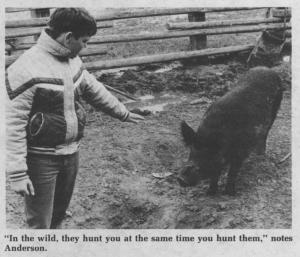 "A friend from Nebraska told me about the pigs," Anderson says. "A truckload of 50 of them were enroute to Hollywood for a movie. I met the trailer in Cheyenne, Wyo., and was allowed to take one boar and two sows off the truck."